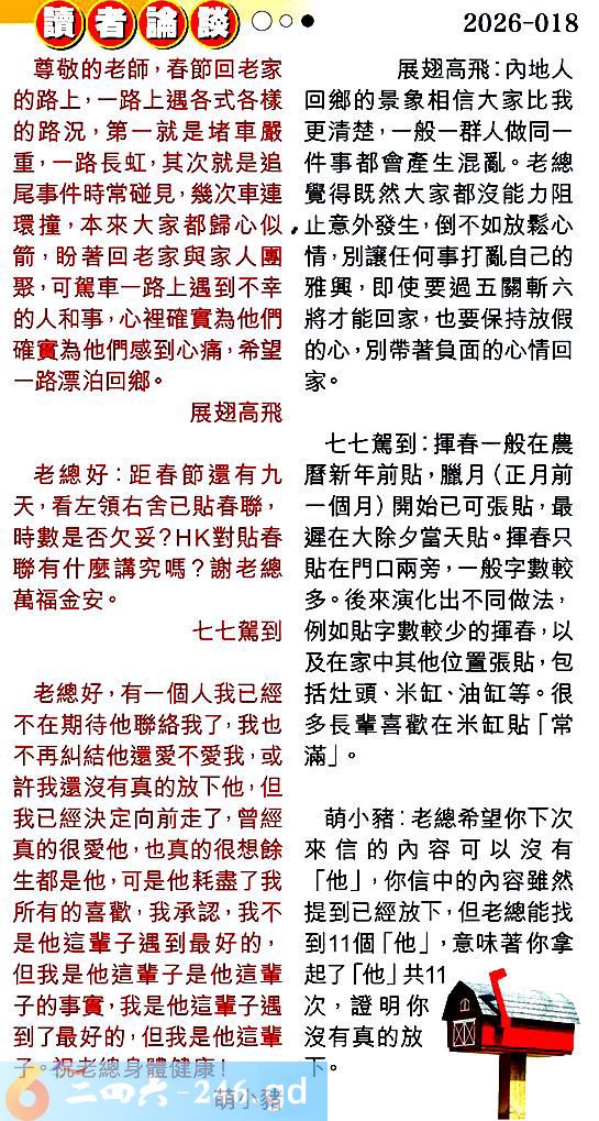 第018期讀者論談 1.尊敬的老師,春節回老家的路上,一路上遇各式各樣的路況,第一就是堵車嚴重,一路長虹,其次就是追尾事件時常碰見,幾次車連環撞,本來大家都歸心似箭,盼著回老家與家人團聚,可駕車一路上遇到不幸的人和事,心裡確實為他們確實為他們感到心痛,希望一路漂泊回鄉。展翅高飛 〖展翅高飛〗:內地人回郷的景象相信大家比我更清楚,一般一群人做同一件事都會產生混亂。老總覺得既然大家都沒能力阻止意外發生,倒不如放鬆心情,別讓任何事打亂自己的雅興,即使要過五關斬六將才能回家,也要保持放假的心,別帶著負面的心情回家。 2.老總好:距春節還有九天,看左領右舍已貼春聯,時數是否欠妥?對貼春聯有什麼講究嗎?謝老總萬福金安。七七駕到 〖七七駕到〗:揮春一般在農暦新年前貼,臘月(正月前一個月))開始已可張貼,最遲在大除夕當天貼。揮春只貼在門口兩旁,一般字數較多。後來演化出不同做法,例如貼字數較少的揮春,以及在家中其他位置張貼,包括灶頭、米缸、油缸等。很多長輩喜歡在米缸貼「常滿」。 3.老總好,有一個大我已經不在期待他聯絡我了,我也不再糾結他還爱不爱我,或許我還沒有真的放下他,但我已經決定向前走了,曾經真的很愛他,也真的很想餘生都是他,可是他耗盡了我所有的喜歡,我承認,我不是他這輩子遇到最好的,但我是他這輩子是他這輩子的事實,我是他這輩子遇到了最好的,但我是他這輩子。祝老總身體健康!萌小猪 〖萌小猪〗:老總希望你下次來信的内容可以沒有「他」,你信中的内容雖然提到已經放下,但老總能找到11個「他」,意味著你拿起了「他」共11次,證明你沒有真的放下。