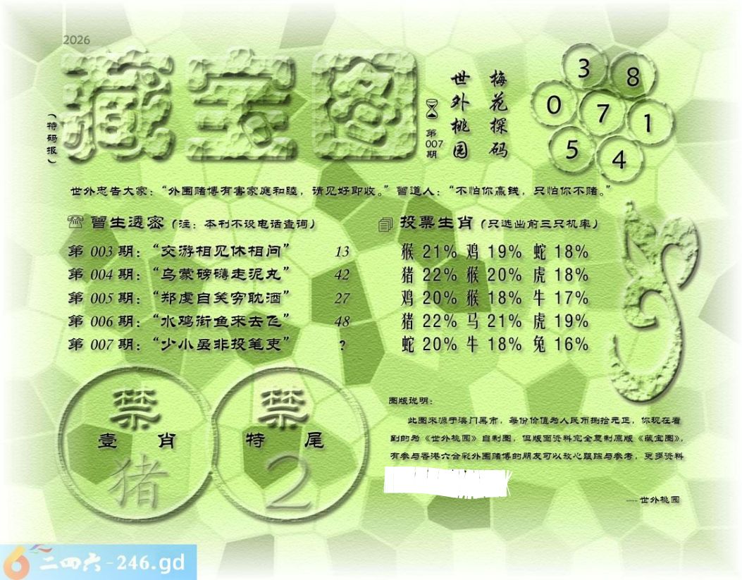 007期藏寶圖 新:已陪沁水追欢日 老:少小虽非投笔吏 禁:猪禁:2尾玄機字:《空》