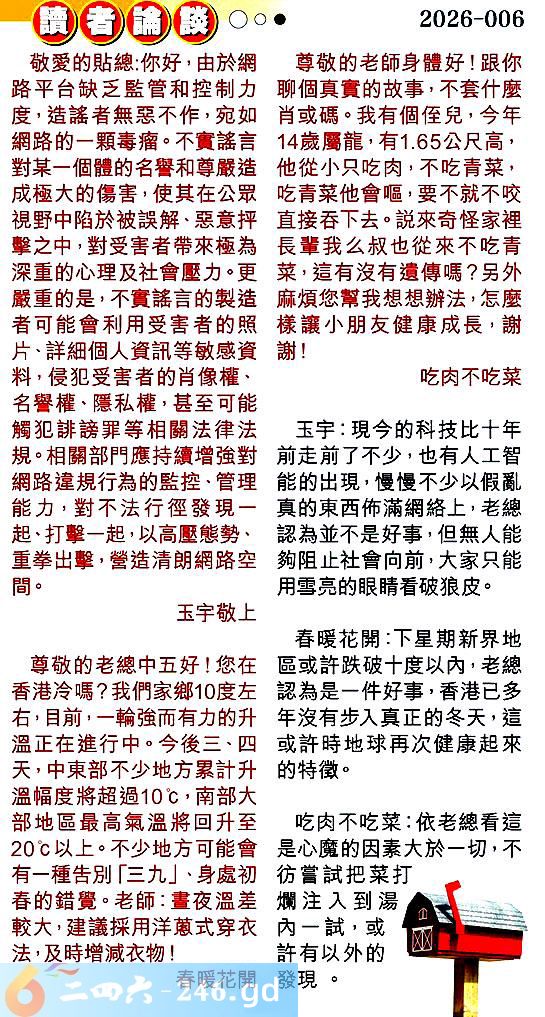 1.敬愛的貼總:你好,由於網路平台缺乏監管和控制力度,造謠者無惡不作,宛如網路的一顆毒瘤。不實謠言對某一個體的名譽和尊嚴造成極大的傷害,使其在公眾視野中陷於被誤解、惡意抨撃之中,對受害者带來極為深重的心理及社會壓力。更嚴重的是,不實謠言的製造者可能會利用受害者的照片、詳細個人資訊等敏感資料,侵犯受者害私的肖像權、名譽權、隠權,甚至可能觸犯誹謗罪等相關法律法規。相關部門應持續增強對網路違規行為的監控、管理能力,對不法行徑發現一起,打撃一起,以高壓態勢、重拳出撃,營造清朗網路空間。玉宇敬上