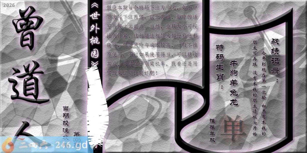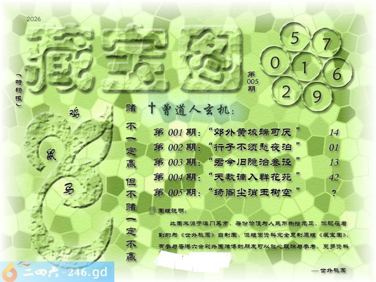 六合彩005期:跑狗玄機/密圖詩/粤彩三语/特碼后语/另版四字梅花诗/藏寶圖
