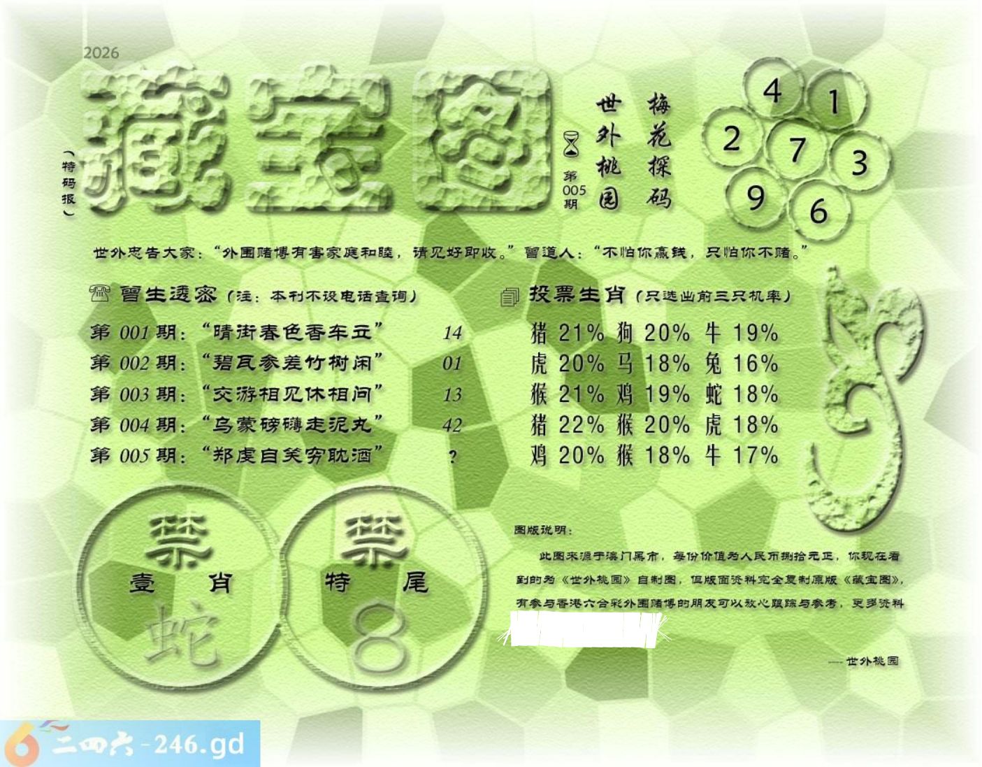 005期藏寶圖 新:倚阁尘消玉树空 老:郑虔自笑穷耽酒 禁:蛇禁:8尾玄機字:《滋》