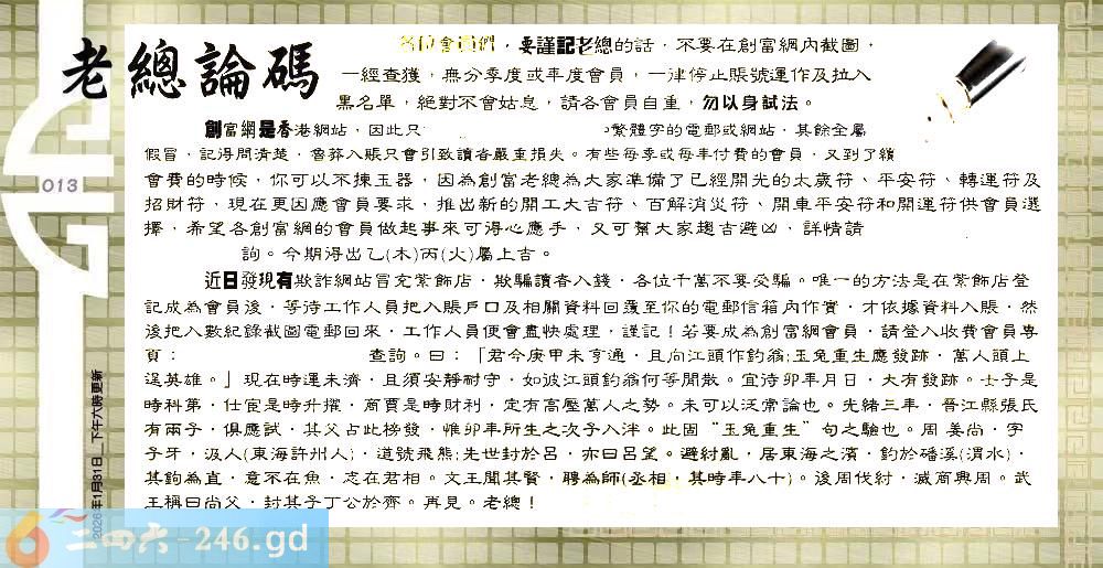 六合彩013期:六合皇金句/老总论码/萧公子/林大师/五行夺码/老总信箱截图