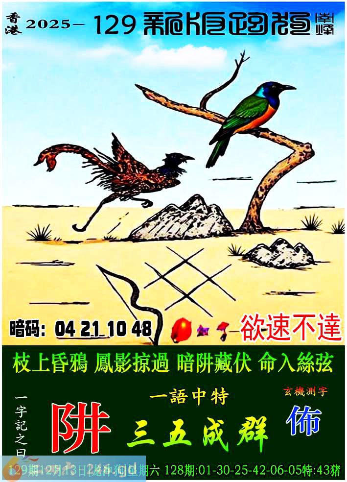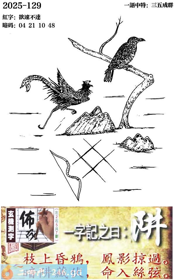 129期跑狗一字記之曰:【阱】 枝上昏鴉,鳳影掠過。 暗阱藏伏,命入絲弦。 玄機測字:《佈》 一語中特:三五成群