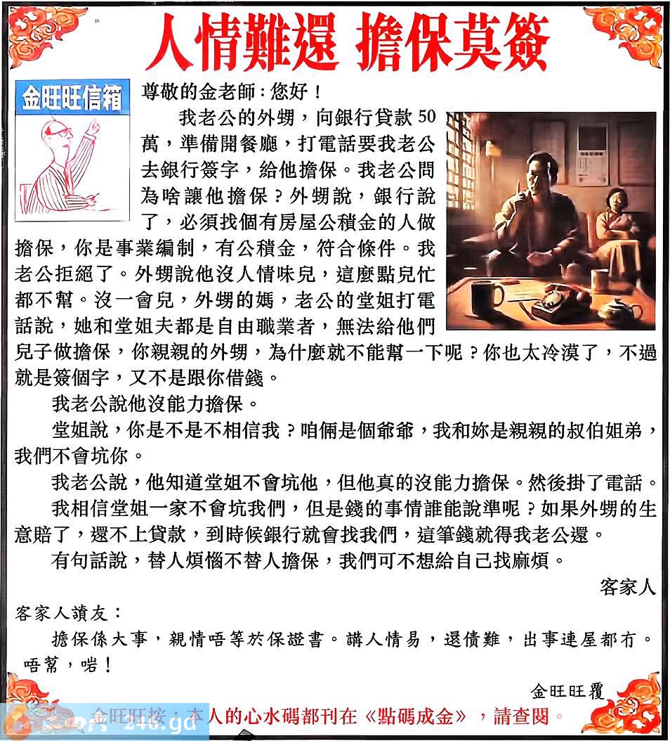 六合彩129期:金旺旺信箱彩民推荐→→《人情難還 擔保莫簽》