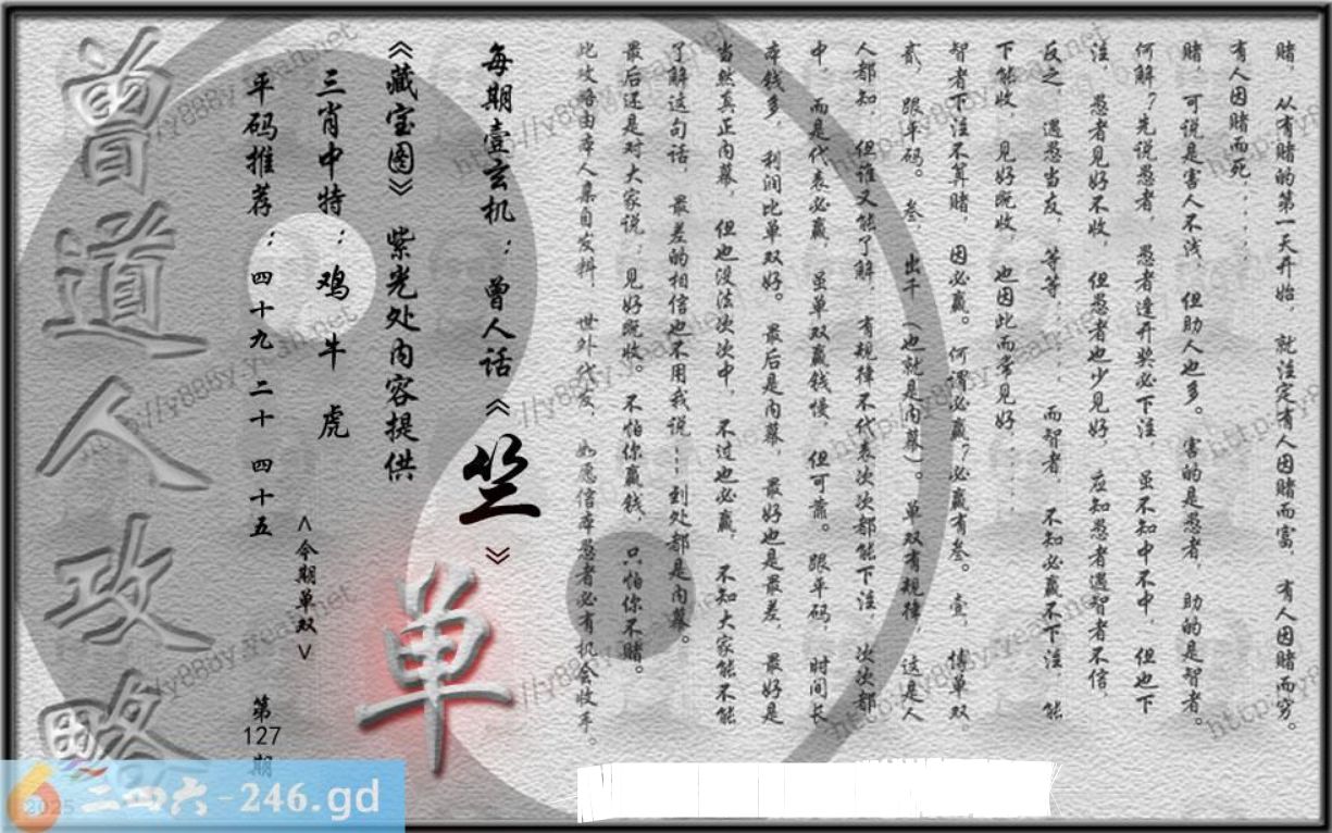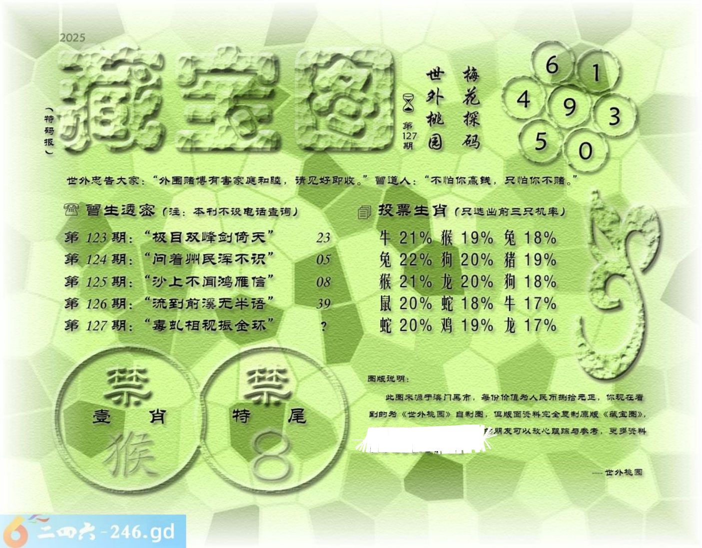127期藏寶圖 新:好遣文星守躔次 老:毒虬相视振金环 禁:猴禁:8尾玄機字:《竺》 财爷送:“何必求神仙”