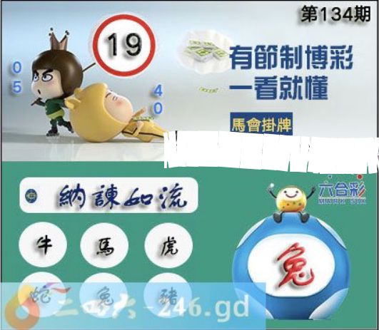 六合彩134期正版彩图挂:19 爆:兔 挂牌成语:纳谏如流 挂牌出肖:牛马虎蛇兔猪
