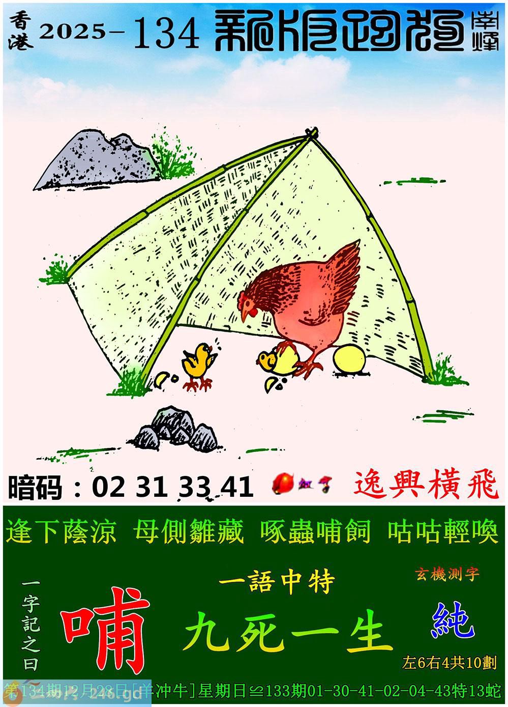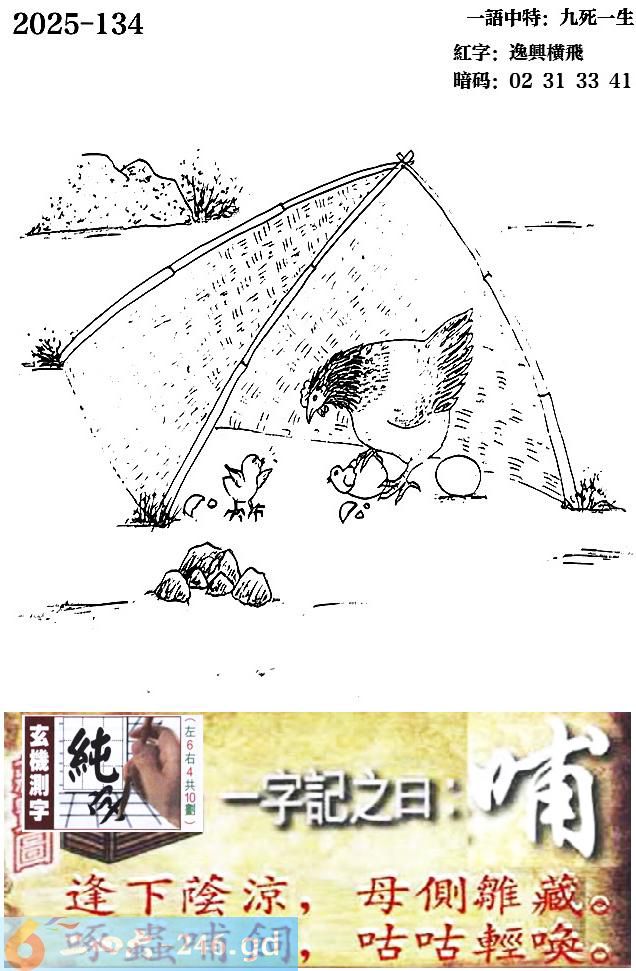 134期跑狗一字記之曰:【哺】 逢下蔭涼,母側雛藏。 啄蟲哺飼,咕咕輕喚。 玄機測字:《純》 一語中特:九死一生