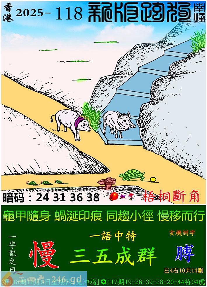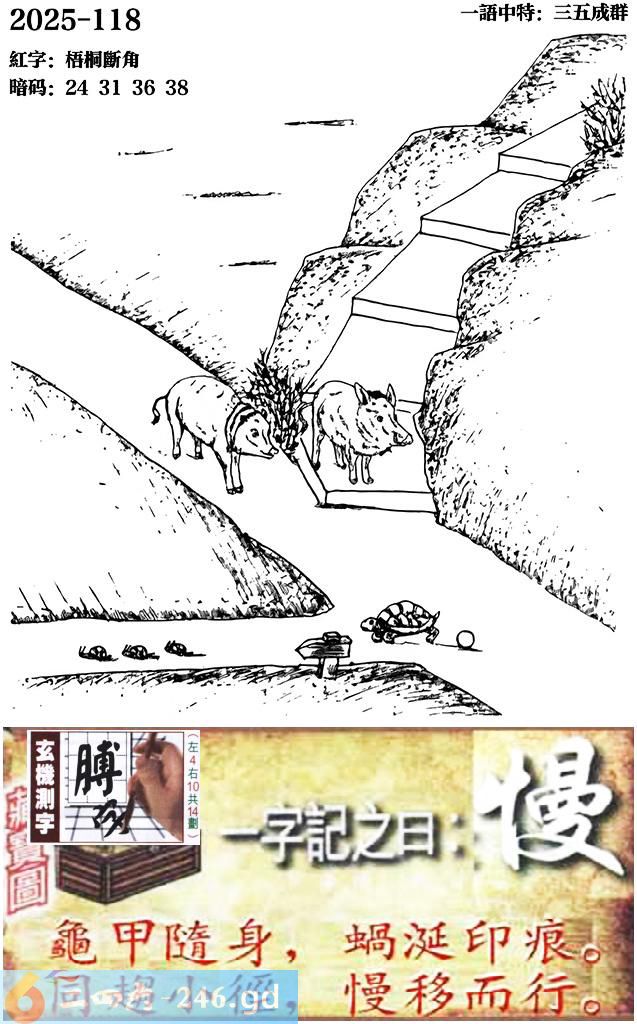 118期跑狗一字記之曰:【慢】 龜甲隨身,蝸涎印痕。 同趨小徑,慢移而行。 玄機測字:《膊》 一語中特:三五成群