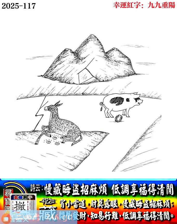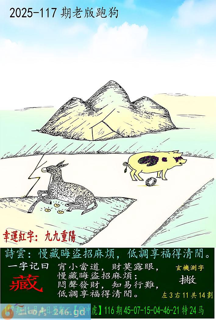 117期老版跑狗一字記之曰:【藏】 詩雲:慢藏晦盜招麻煩,低調享福得清閒。 宵小當道,財莫露眼,慢藏晦盜招麻煩; 悶聲發財,知易行難,低調享福得清閒。 玄機測字:《撇》