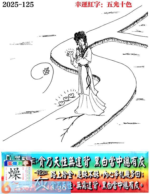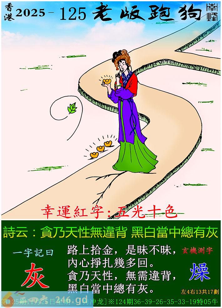125期老版跑狗一字記之曰:【灰】 詩雲:貪乃天性無違背,黑白當中總有灰。 路上拾金,是昧不昧,內心掙扎幾多回。 貪乃天性,無需違背,黑白當中總有灰。 玄機測字:《燥》