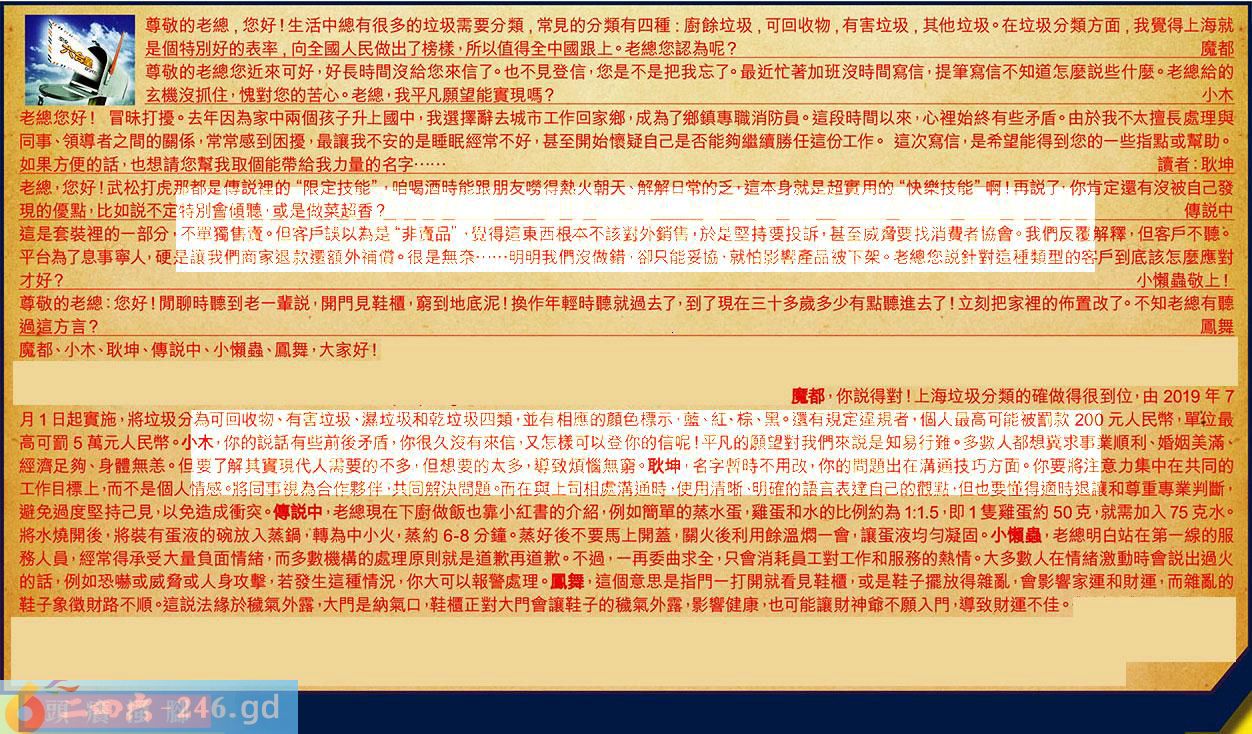 【1】.尊敬的老總,您好!生活中總有很多的垃圾需要分類,常見的分類有四種:廚餘垃圾,可回收物,有害垃圾,其他垃圾。在垃圾分類方面,我覺得上海就是個特別好的表率,向全國人民做出了榜樣,所以值得全中國跟上。老總您認為呢?魔都