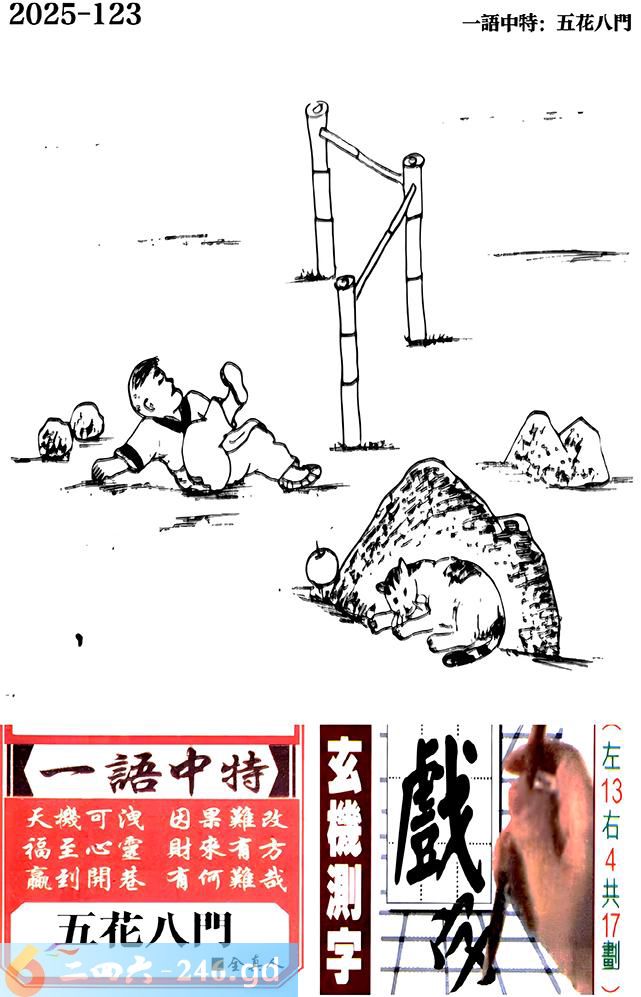 123期跑狗一字記之曰:【躲】 屏氣凝神,躲於石陰。 聞聲不語,笑等追尋。 玄機測字:《戲》 一語中特:五花八門