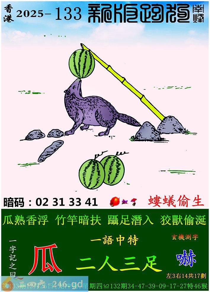133期跑狗一字記之曰:【瓜】 瓜熟香浮,竹竿暗扶。 躡足潛入,狡獸偷涎。 玄機測字:《嚇》 一語中特:二人三足