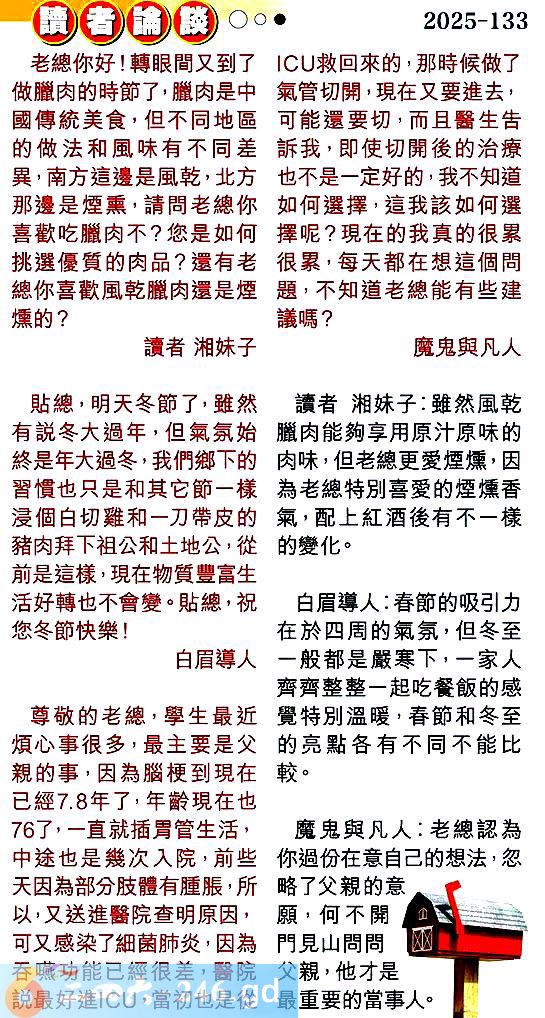 2.貼總,明天冬節了,雖然有說冬大過年,但氣氛始終是年大過冬,我們鄉下的習慣也只是和其它節一樣浸個白切雞和一刀帶皮的豬肉拜下祖公和土地公,從前是這樣,現在物質豐富生活好轉也不會變。貼總,祝您冬節快樂!白眉導人