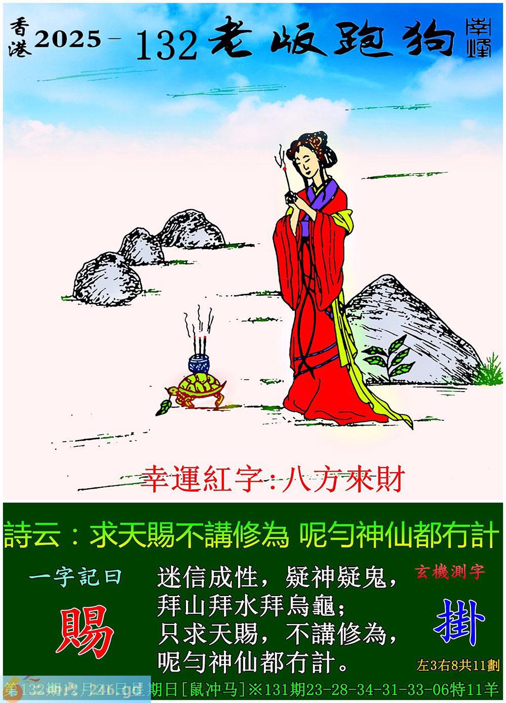 六合彩132期老版跑狗一字記之曰:【賜】 詩雲:求天賜不講修為,呢勻神仙都冇計。