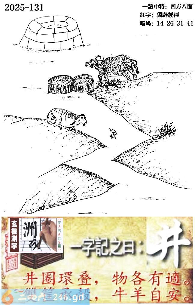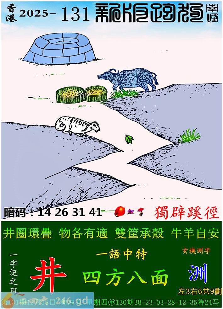 131期跑狗一字記之曰:【井】 井圈環疊,物各有適。 雙筐承殼,牛羊自安。 玄機測字:《洲》 一語中特:四方八面