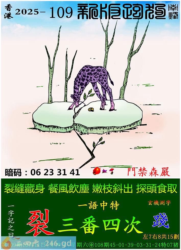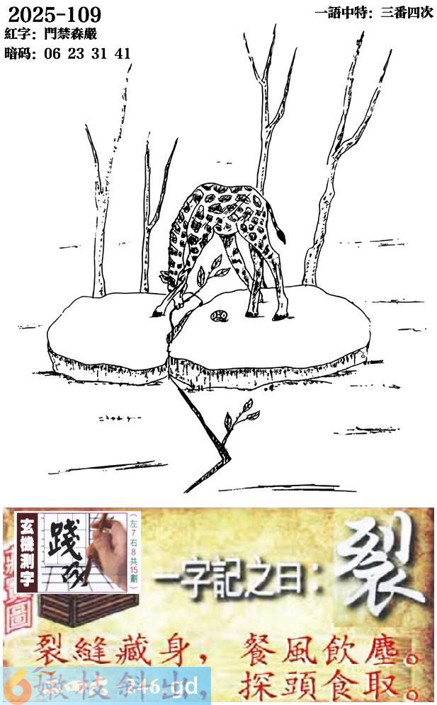 109期跑狗一字記之曰:【裂】 裂縫藏身,餐風飲塵。 嫩枝斜出,探頭食取。 玄機測字:《踐》 一語中特:三番四次