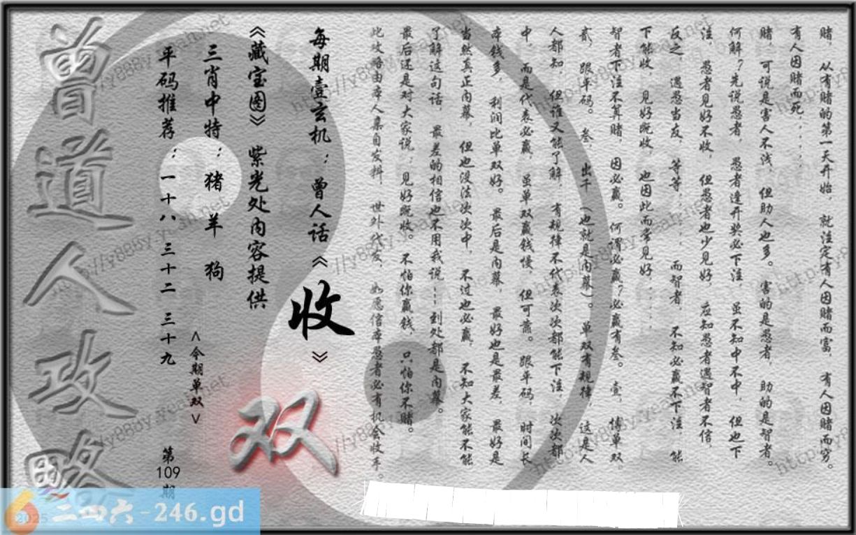 六合彩109期玄机特码料:神机妙算诸葛刘,两仪四象演春秋。决定成败在真主,何必叹惜恨悠悠?心水玄机:三八前后开