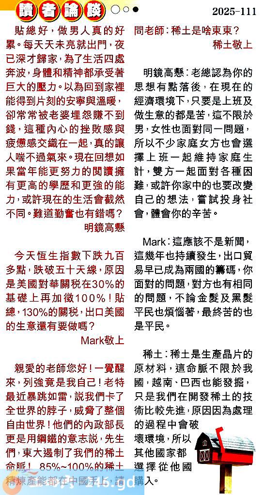 第一一一期讀者論談 1.貼總好,做男人真的好累。每天天未亮就出門,夜已深才歸家,為了生活四處奔波,身體和精神都承受著巨大的壓力。以為回到家裡能得到片刻的安寧與溫暖卻常常被老婆埋怨賺不到錢,這種內心的挫敗感與疲憊感交織在一起,真的讓人喘不過氣來。現在回想如果當年能更努力的閱讀擁有更高的學歷和更強的能力或許現在的生活會截然不同。難道勤奮也有錯嗎?明鏡高懸 〖明鏡高懸〗:老總認為你的思想有點落後,在現在的經濟環境下,只要是上班及做生意的都是苦,這不限於男,女性也面對同一問題,所以不少家庭女方也會選擇上班一起維持家庭生計,雙方一起面對各種困難,或許你家中的也要改變自己的想法,嘗試投身社會,體會你的辛苦。 2.今天恒生指數下跌九百多點,跌破五十天線,原因是美國對華關税在30%的基礎上再加徵100%!貼總,130%的關税,出口美國的生意還有要做嗎?敬上 〖〗:這應該不是新聞,這幾年也持續發生,出口貿易早已成為兩國的籌碼,你面對的問題,對方也有相同的問題,不論金髪及黑委平民也煩惱著,最終苦的也是平民。 3.親愛的老師您好!一覺醒來,列強竟是我自己!老特最近暴跳如雷,說我們卡了全世界的脖子,威脅了整個自由世界!他們的內政部長更是用鋼鐵的意志說,先生們,東大遏制了我們的稀土命脈!85%100%的稀土精煉產能都在中國手上,請問老師:稀土是啥東東?稀土敬上 〖稀土〗:稀土是生產晶片的原材料,這命脈不限於我國,越南、巴西也能發掘,只是我們在開發稀土的技術比較先進,原因因為處理的過程中會破壞環境,所以金其他國家都選擇從他國購入。
