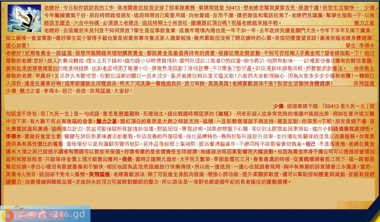 第110期《六合皇信箱文字版》10000%正確!!!正版二四六論壇*精心製作!!! 少偉、魅力之星、李得水、妲己、依依、突飛猛進,大家好! 【1】.老總好,今日和你談談我的工作,我老闆最近給我安排了部車跑業務,車牌尾號是59413,想老總您幫我算算吉兕,感激不盡!祝您生活愉快...少偉 〖少偉〗:這個車牌不錯,「59413吾九死一生」這句話並不存在,但「九死一生」是一句成語,意思是歷盡艱險,死裡逃生。語出戰國時期屈原的《離騷》,用來形容人從非常危險的境遇中逃脱出來,例如在意外或災難中活下來,有大難不死必有後福的含意。 【2】.今年屬豬運氣不好,前段時間錢借朋友,這段時間自己需要用錢,向他要錢,反而不還,還把微信和電話拉黑了,老總們見識廣,幫學生指點一下,以後路該怎麼走,六合中特碼,必須跟土老總走,這段時間土小肖很旺,繼續跟紅頂白嗎?祝福老總越來越年輕。魅力之星 〖魅力之星〗:跟紅頂白的意思是大熱之時就支持、追隨,一旦形勢衰落就不再支持,甚至反對,你深思一下吧!朋友借錢不還,首先應嘗試溫和溝通,協商還款計劃,並盡可能保留所有證據如借攄、對話紀錄、匯款證明。如果你能狠下心腸,可以到法院提起民事訴訟,或向小額錢債審裁處提告。 【3】.老總好,去信幾封未見刊登不知何原故?學生是從事飲食業,這幾年環境內棬也是一年不如一年,去年底終究還是關門大吉。今年下半年又南下廣東,給工廠裡一食堂掌廚。還好學生從小習得手藝也算是術業有專攻養活家人還算勉強,雖然累點但沒有了開店鋪時的心累。來信叨擾還望見諒!最後祝福老總身體健康;遂心如意!學生:李得水 〖李得水〗:要做好食堂生意,關鍵在於提供美味惠的餐點、營造友善的用餐環境、强化品牌特色、善用智慧科技提升效率,並持續收集顧客的意見以改善服務。你需要提供具有高性價比的餐點,並確保份量足夠讓顧客覺得划算。另外盡量縮短上菜時間,提高餐廳翻桌率,不過同時不能影響食物質素。 【4】.老總好!近期看黃金一路猛漲,我想用點閒錢來理財購買黃金,都說黃金是最值得持有的资產,根據近期走勢波動,不知可否短期入手黄金呢?望老總指點一下!妲己 〖妲己〗:不是馬後炮,老總在黃金還未大漲之前已經提示讀者有閒錢可以買些來保值。你要考慮的是金價會受全球經濟、地緣政治等因素影響而大幅波動。也因為黃金本身不像公司可以透過經營增加盈利和發放股息,只能等待金價上漲才能賣出獲利。 【5】.尊敬的老總:您好!故人西辭黃鶴樓,煙火三月下揚州。這句詩小學時便背得熟,當時只覺是江南春日的斕漫。如令再讀,倒別有新味一一詩裡那份春日獨有的鮮活意趣,竟和近來街頭巷尾冒出的新景敏很像,比如老店裡添了新潮小吃,尋常巷弄擺起了雅繳花攤,平日里多了份驚喜。對這重新味頗有感觸,想聽聽您的看法。依依敬上 〖依依〗:當時正逢開元盛世,太平而又繁榮,季節是煙花三月、春意最濃的時候,從黃鶴樓順著長江而下,這一路都是繁花似錦。李白心裡沒有甚麼憂傷和不愉快,相反地認為孟浩然這趟旅行快樂得很。所以他一邊送別,一邊心也就跟著飛翔,胸中有無窮的詩意隨著江水蕩漾。當然,美景令人悦目,送別卻不免令人傷懷。 【6】.尊敬的老總:早晨好!又是許久未聯絡您,但對創富網的關詿直未減少,最近老總放料真是又猛又勁!六友群大家都很開心,因為大家多多少少都有收穫!一轉眼已入深秋,還是在廣東好啊!這季節還能去河裡游泳,昨天下河洗澡一番進退自如、游刃有餘,美哉美哉!老總喜歡游泳不洛?祝您生活愉快身體健康!突飛猛進 〖突飛猛進〗:老總喜歡游泳,除了可促進全身肌肉發展、增強心肺功能、提升柔關節軟度,還可以幫助控制體重與減脂,並能有效舒緩壓力、改善情緒與睡眠品質。亦由於水的浮力可減輕對關節的壓力,所以游泳是一項對老總這個年紀的長者極佳的運動選擇。 紅字:扭轉乾坤 暗码:01172728 [释义]比喻从根本上改变整个局面。